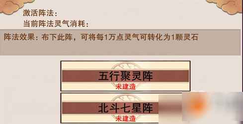 最后小编要提醒各位的是,五行聚灵阵开启后能够转化灵气为灵石,要等集齐了残阵后才能合成成阵法,然后在洞府布下大阵。