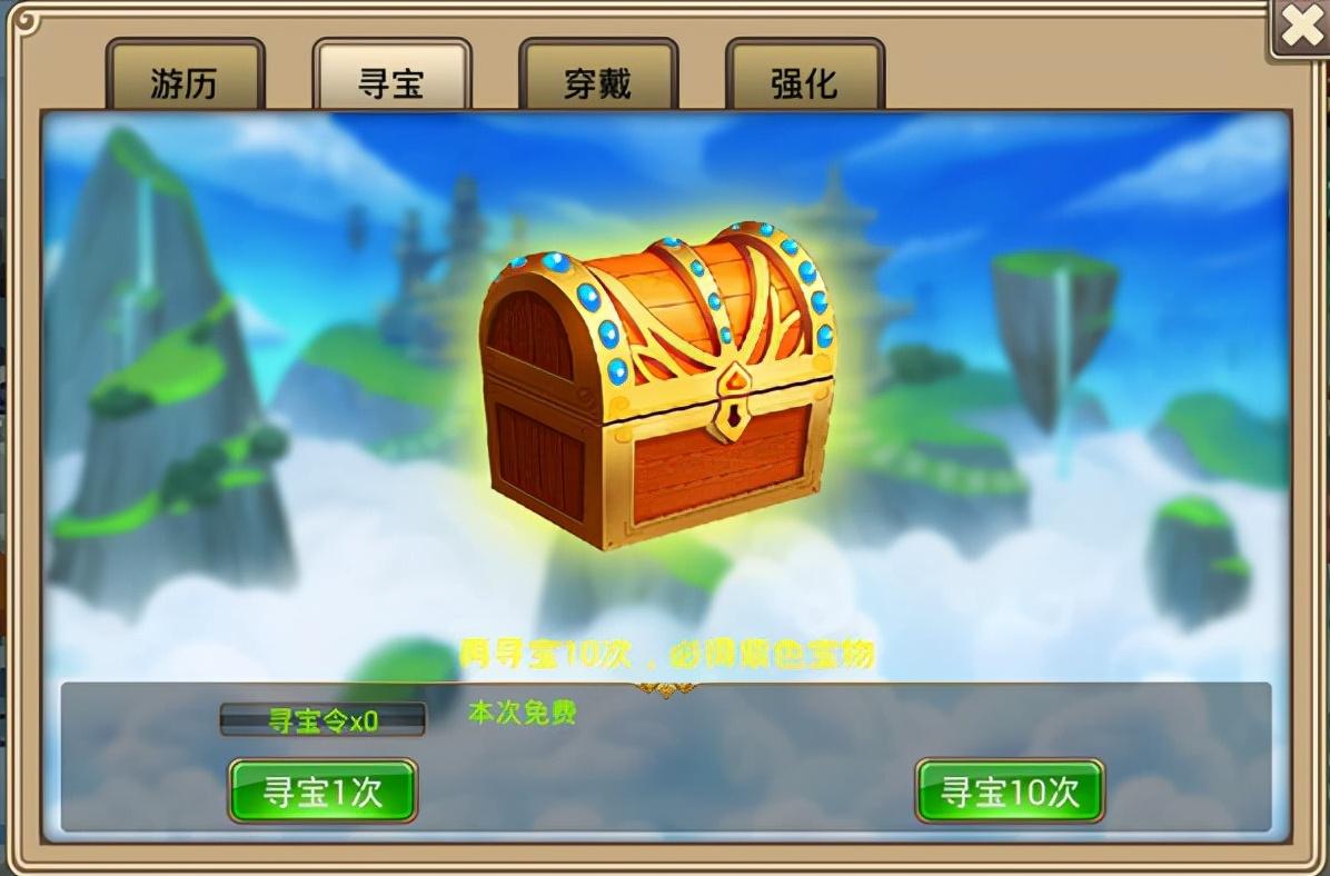 4、寻宝:分寻宝1次和寻宝10次,寻宝会消耗寻宝令,或者可以消耗250元宝,而且每48个小时会免费给玩家寻宝一次,寻宝10次后必得紫色宝物。寻宝10次是方便玩家多次寻宝,快速找到自己需要的神兵和法宝