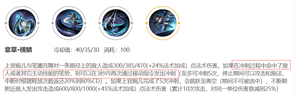 本文不讲玩法,不讲功能,只说连招,而婉儿的上天逻辑在大招的说明上已经讲的很清楚了,只要在冲刺过程中,命中了敌方单位,或者主动技能的笔势(一二技能),那么三秒内就可以继续冲刺,如果不断命中目标或者笔势,最多五次后就飞天了。