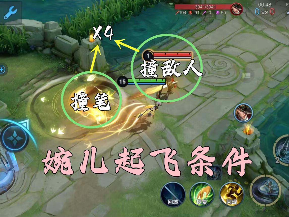 大招撞击笔势,不管是冲锋瞬间还是即将结束都可以,所以婉儿连招可以拐笔,既向前冲锋第二段,向侧面,或者回退触发第二段,有时候怕对面伤害太高无法起飞,所以可以在原地先叠加两层,之后大闪冲到人群里打出少量撞击以及飞天伤害。