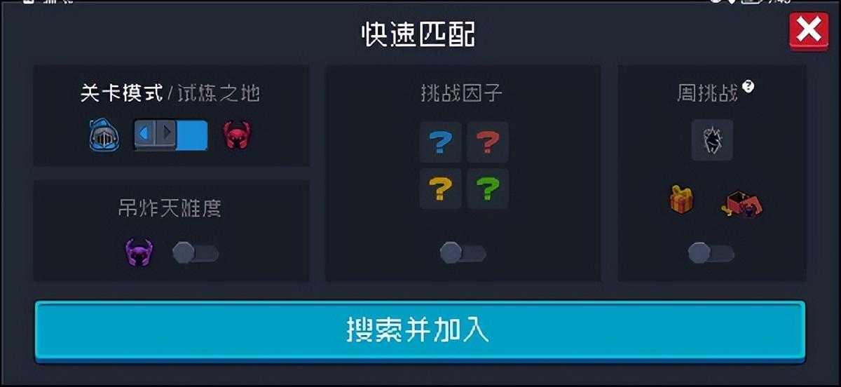 5.在这里你可以选择你要加入的模式,每一个都可以单独选择,打材料就打试炼,打蓝币就开挑战因子,不过有时可能会搜不到。
