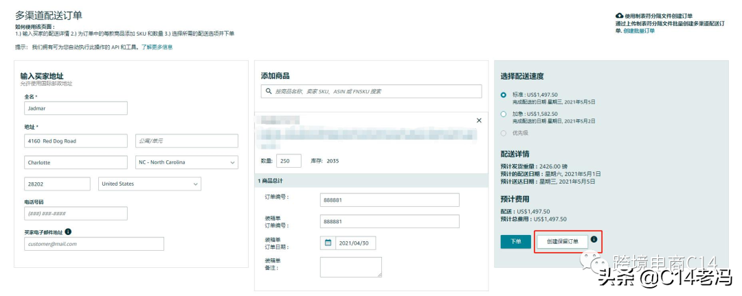 这样一个 250 件的多渠道配送订单就创建好了,然后按照上述的方法重复创建至 6798 件,PS:如果有多个 SKU 分散的库存,则每个 SKU 各创建一些保留订单,每个 SKU 保留些许库存,防止断货,最好在美国的半夜时间创建(或者自己对应产品单量较少的时间段创建)