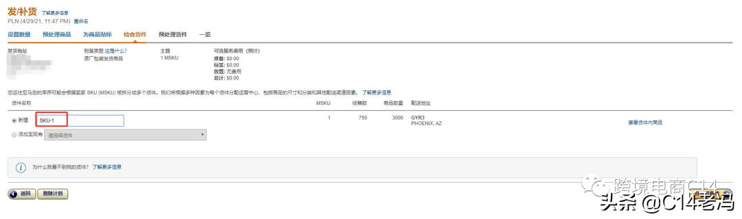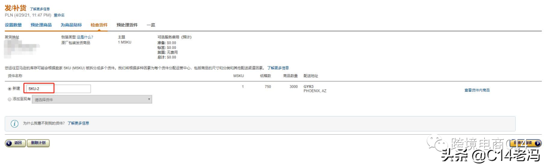 等待10-20分钟以后此时我们需要创建6000件的货件,但是因为我们的最大货件数量为3000,所以我们需要同时创建 2 个 3000 件的货件。在创建货件的时候,同时创建 2 个货件至检查货件的步骤,但不要点批准并继续,如下图,(注意:如果是 2 个不同的 SKU,不能直接点2 个 SKU 然后一直创建发货,那样货件的数量就是 6000 件,就不够了)