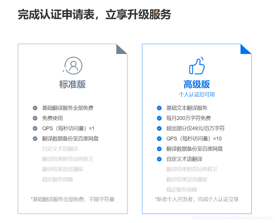 如下图,可以看到如果认证了个人身份,即可使用高级版的翻译接口。
