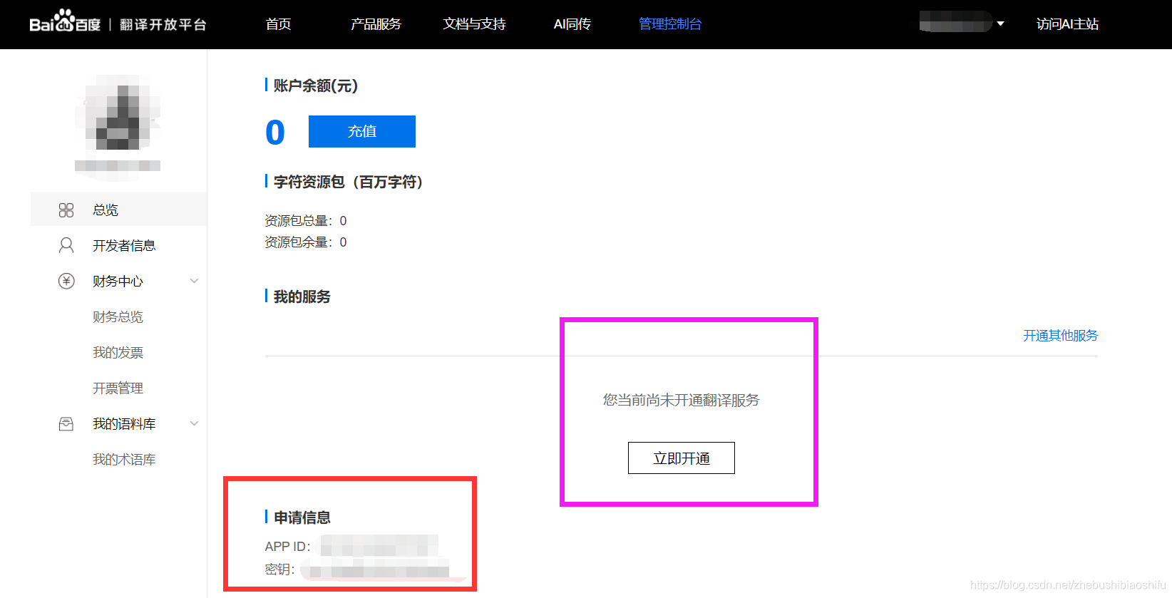 可以看到,此时“管理控制台”中已经有了我们账户的信息,同时接口API以及密钥已经显示在了左下角红色圈内部分。