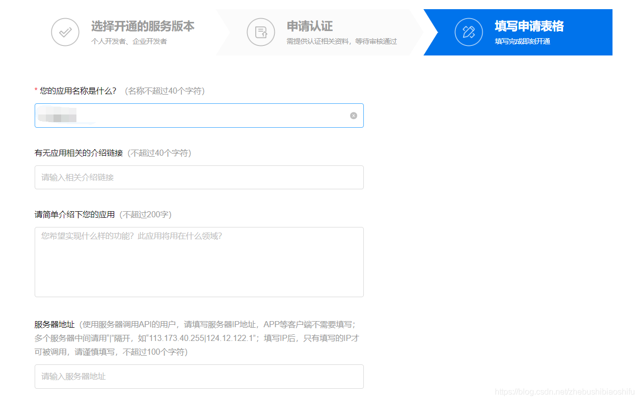 对于标准版而言,我们仅需要在弹出的窗口内填写应用名称(也就是需要获取我们百度翻译API的软件或插件名称)即可;最后两个空,如果我们是自己开发应用的话,可以填一下;如果是授权给别人开发、我们使用的应用的话,一般就不用填了。