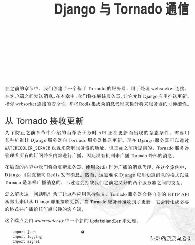 第8 章--Django 和Tornado 通信。将强大的Django 与Tornado 的健壮特性相结合是创建可变、实时的Django 应用的重要标志,通过集成Django 的通信能力扩展Tornado 服务器的功能,来建立一种既安全又可交互的联系。