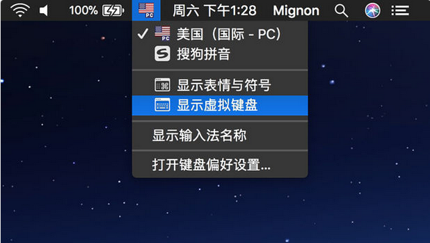 1. 点击菜单栏输入法,再点击显示虚拟键盘(如果没有找到该选项,请看第3步)