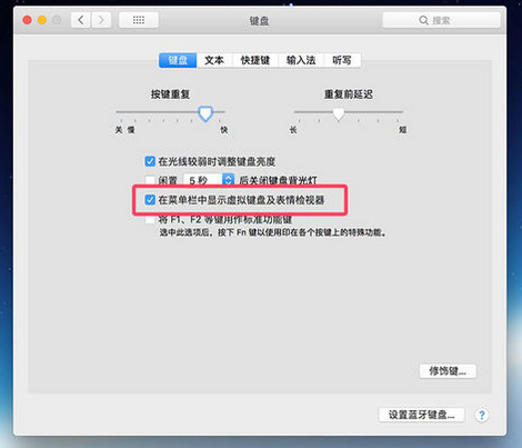 3. 若未找到显示虚拟键盘,打开系统偏好设置,进入键盘标签页,勾选在菜单栏中显示虚拟键盘及表情检视器