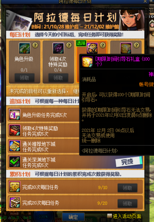 接取通关5次Lv100深渊地下城并完成之后可以获得时间的引导石礼盒(100个),打开获得的时间引导石会在12月2日删除,是可以契合与史诗之路活动的。