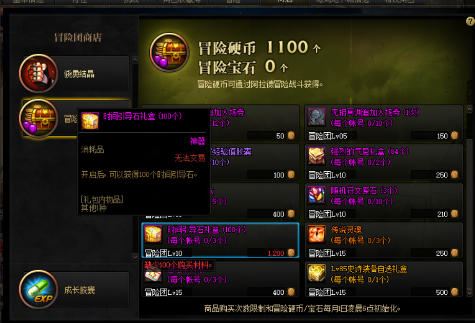 每月可以使用3600个冒险硬币兑换300个时间引导石,获得的引导石依旧为永久。