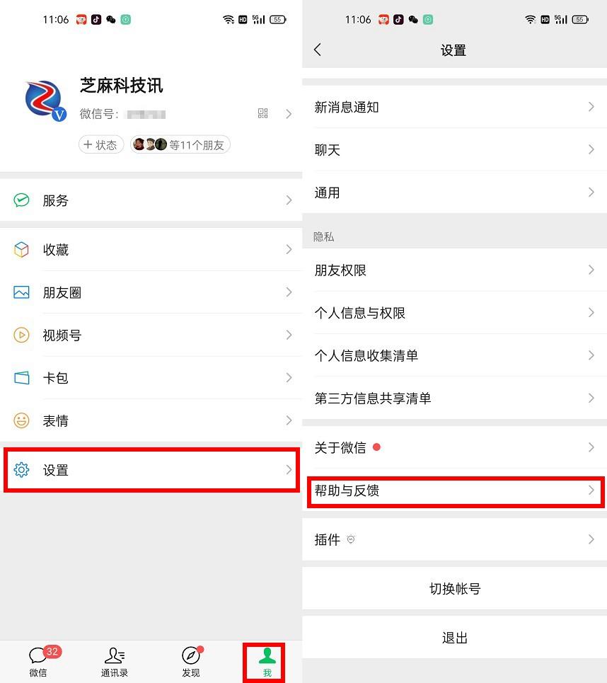 1、首先在手机上打开微信APP,依次点击「 我 」→「 设置 」→「 帮助与反馈 」,如下图所示。
