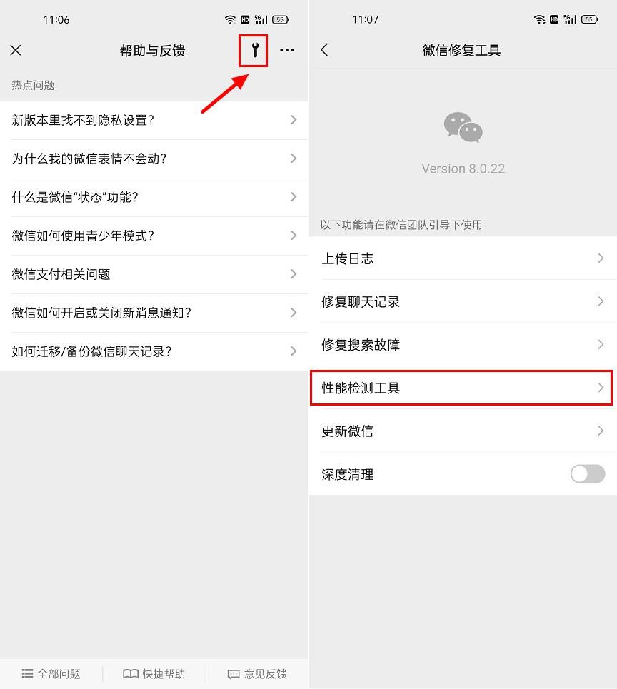 2、进入“帮助与反馈”页面后,再依次点击右上角的「 小扳手图标 」→「 性能检测工具 」,如图所示。