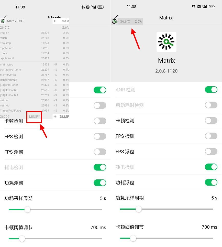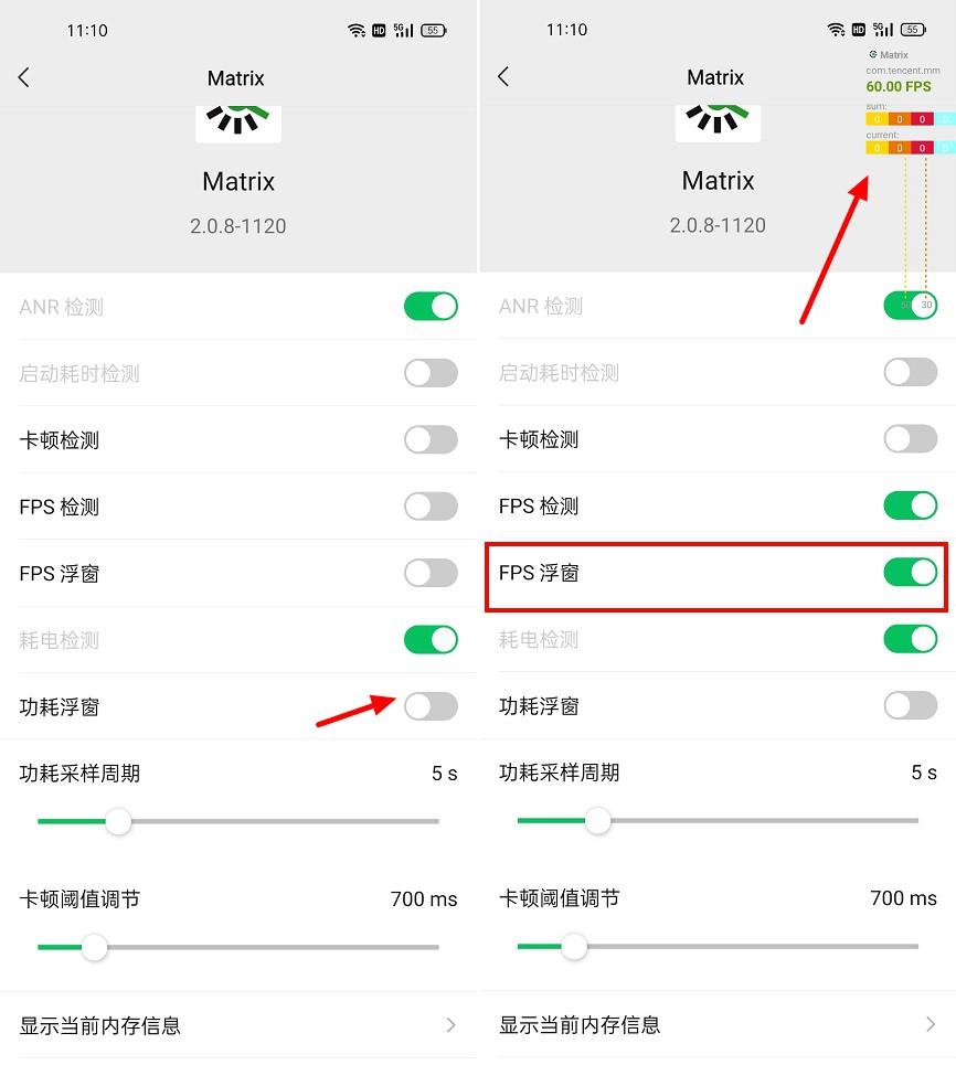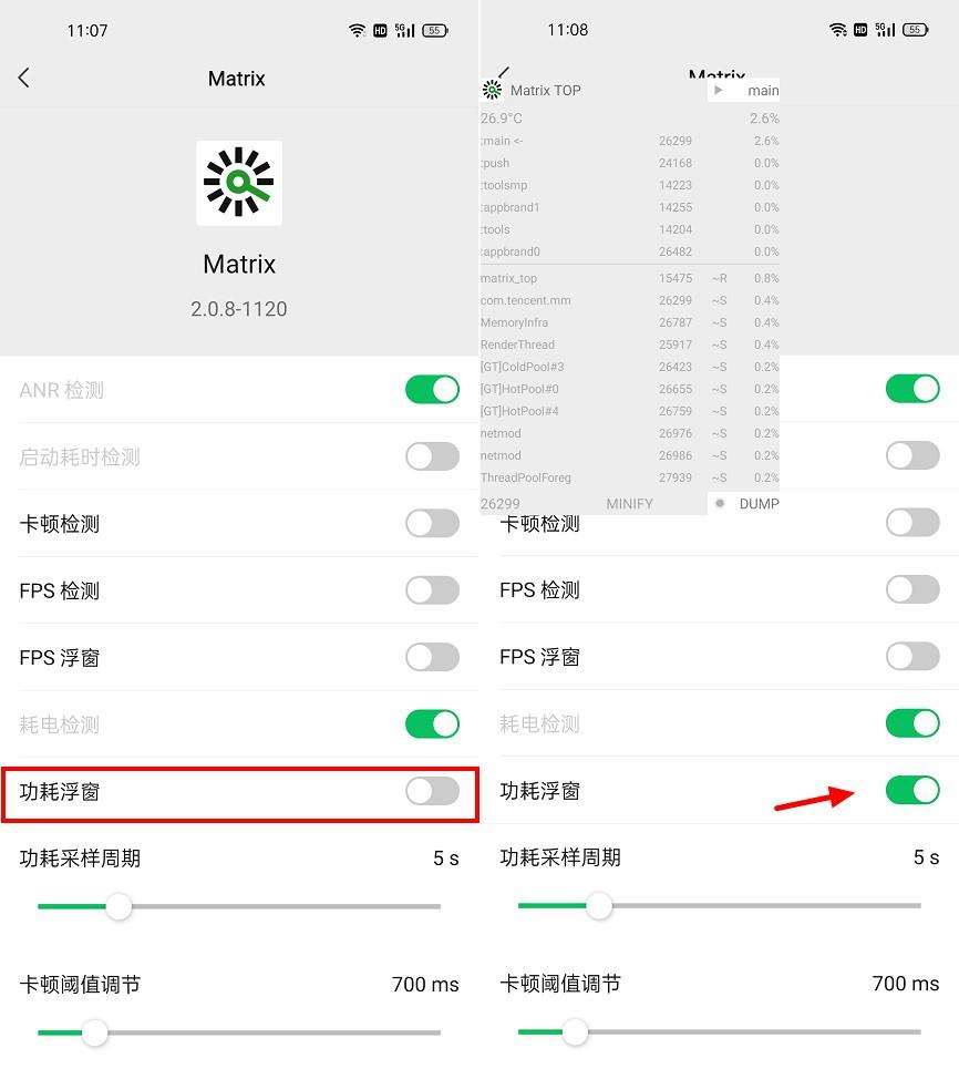 3、接下来会看到一个微信内置的 Matrix 工具,里面提供了 卡顿检测、FPS检测、FPS浮窗、功耗浮窗等工具。如果想要手机显示实时温度,我们只要将下方的「 功耗浮窗 」开关打开就可以看到包括温度等详细的功耗信息了,如图所示。