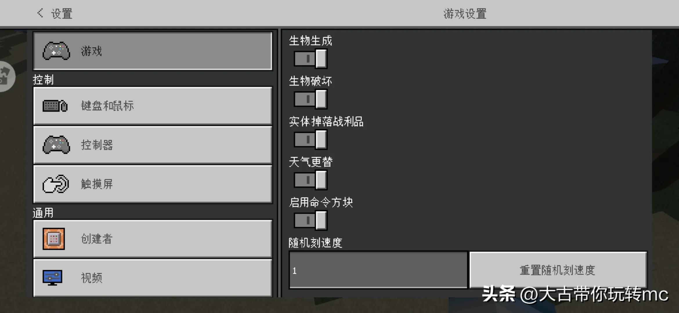 这个随机刻速度呢,相信很多人不知道它是做什么的,算是一个作弊的功能,原因是什么呢,就是当你把它的数值调到很大,很多你种植或者野外的资源都将会快去生长,例如甘蔗,南瓜,土豆,树苗等等