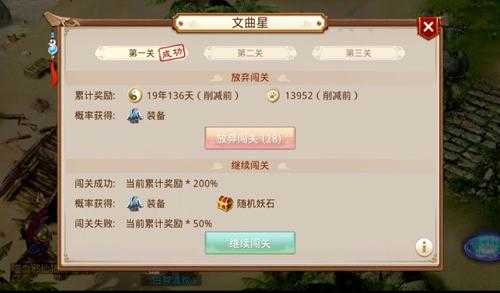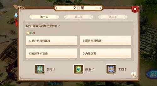 在答题过程中,如果一路连续答对,还有概率获得答题卡(加时卡、探索卡、求助卡中随机一种)。闯关成功可以获得道行和武学数值奖励,以及概率获得装备。当然,关数越高可获奖励也就越丰厚。第三关前50名闯关成功的道友,还有几率拿到女娲石等商城道具哦!