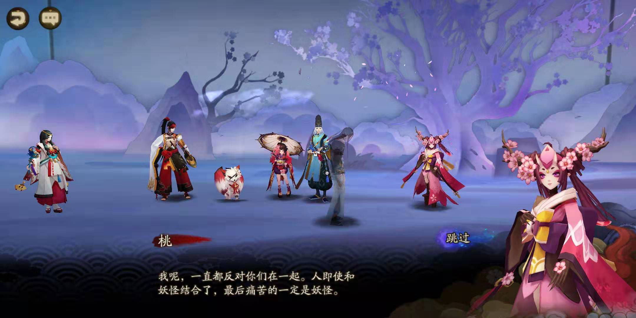 “樱与桃”的故事在第九章,晴明等人路过一片黑色樱花林,本该是一片粉丝的花海,此时却被黑色的烟雾笼罩。晴明他们先是发现了一个死掉的凡人,这个人就是樱花妖的未婚夫忠义,可能是因为已经死掉的原因,忠义的立绘丧得让人不太喜欢。