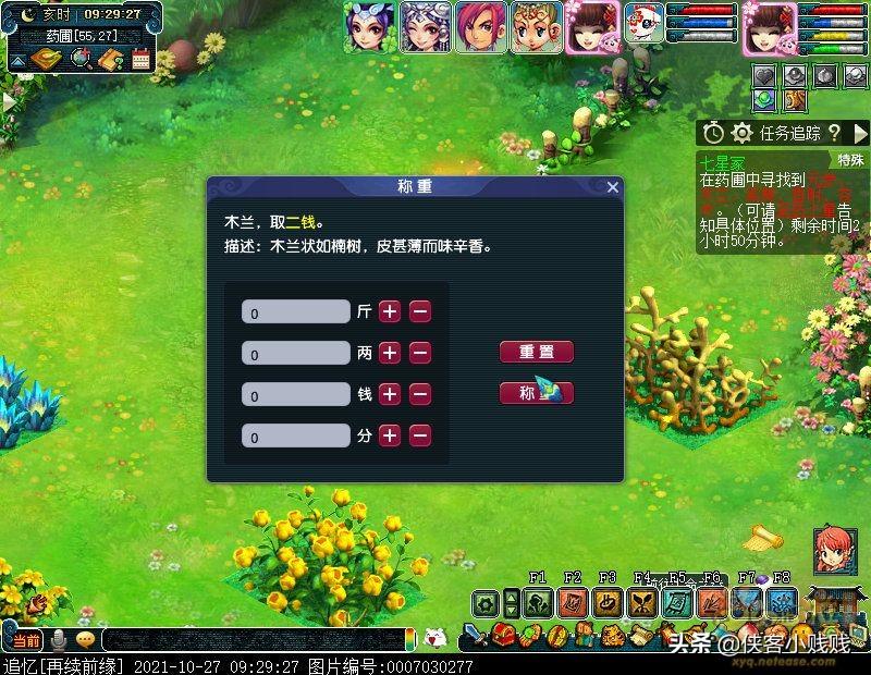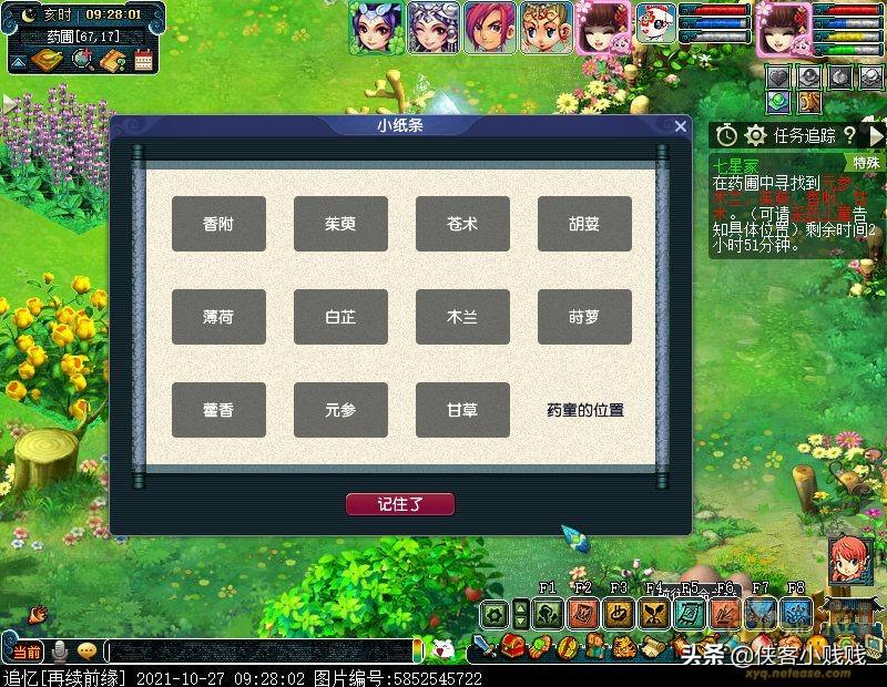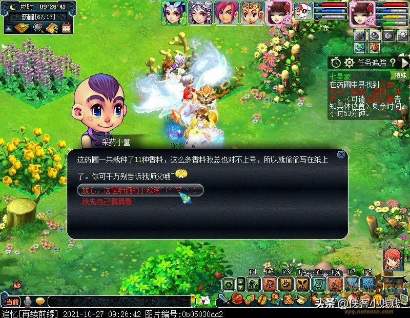 2.前往七星镇之前需按照香料单子做些准备,与蓝老板对话结束传送到药圃,找到采药小童(药圃67,17)可获知每种草药的位置。