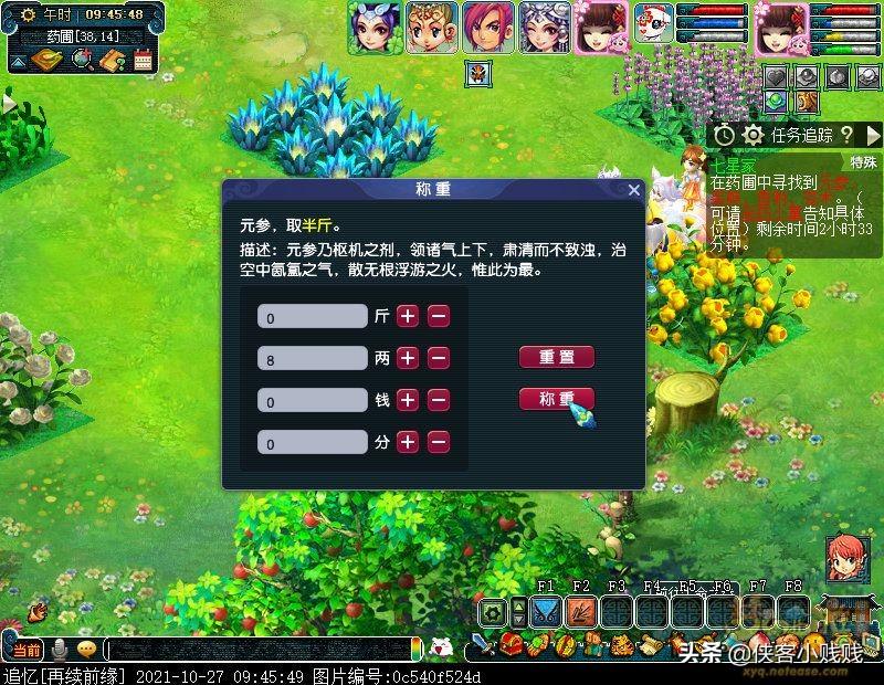 3.找到需要采集的草药并称重,一共五种,找齐后点击采药小童回到药圃,需注意的是半斤称重为八两。
