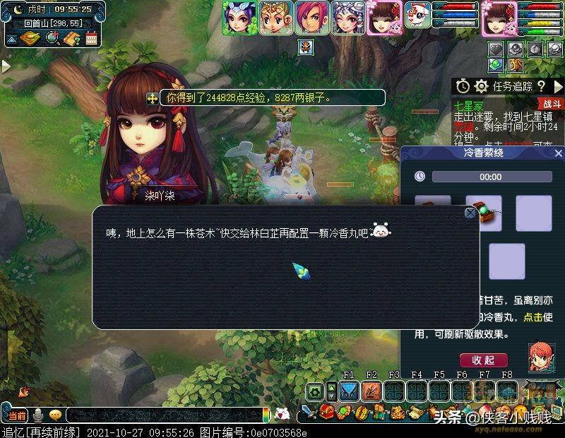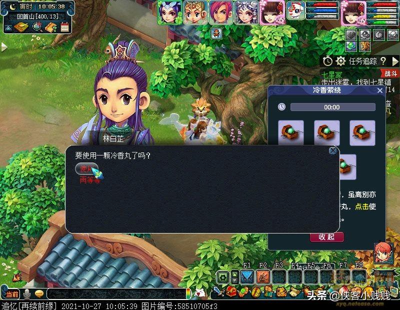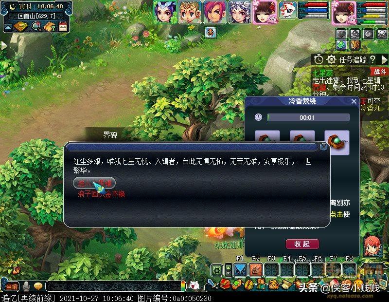 4.动画结束后来到回首山,点击林白芷,需帮助林白芷走出迷雾,找到七星镇界碑(629,7)。途中固定战斗5场,难度不大,每一场战斗获得一颗冷香丸。
