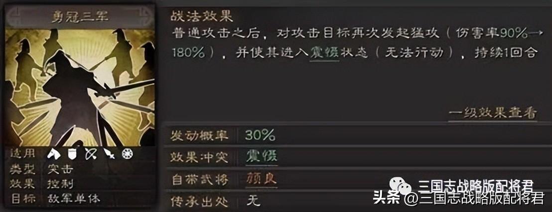 来看看颜良自带的战法:“普通攻击之后,对攻击目标再次发起猛攻(伤害率180%),并使其进入震慑状态(无法行动),持续1回合!”讲道理,这个战法配合裸衣血战+三势阵后,无论是输出还是控制都会有比较高的保证,尤其是先手的情况下,甚至能做到0战损秒人。