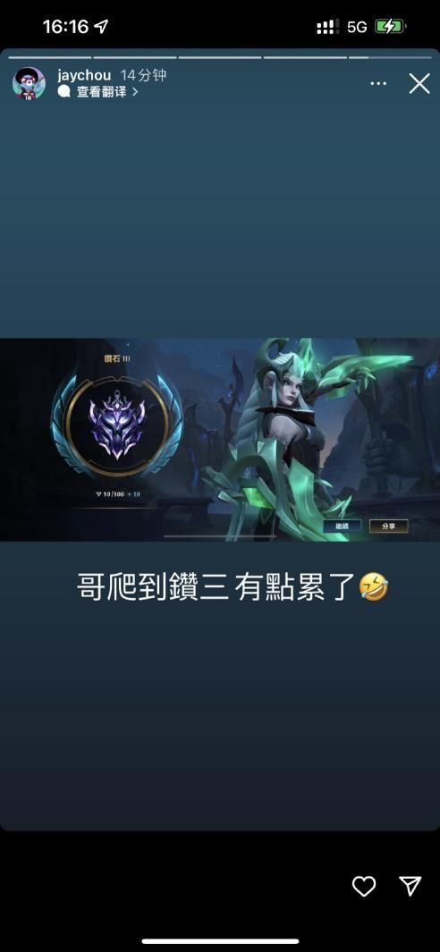 自开服以来,英雄联盟手游一直受到各方大佬的重视,不删档测试时的明星助阵可谓一番佳话。今日,向来沉迷英雄联盟手游的周杰伦,在ins上秀出了自己的最新段位,偷偷上分的周董已经冲上钻三,实力证明自身技术。