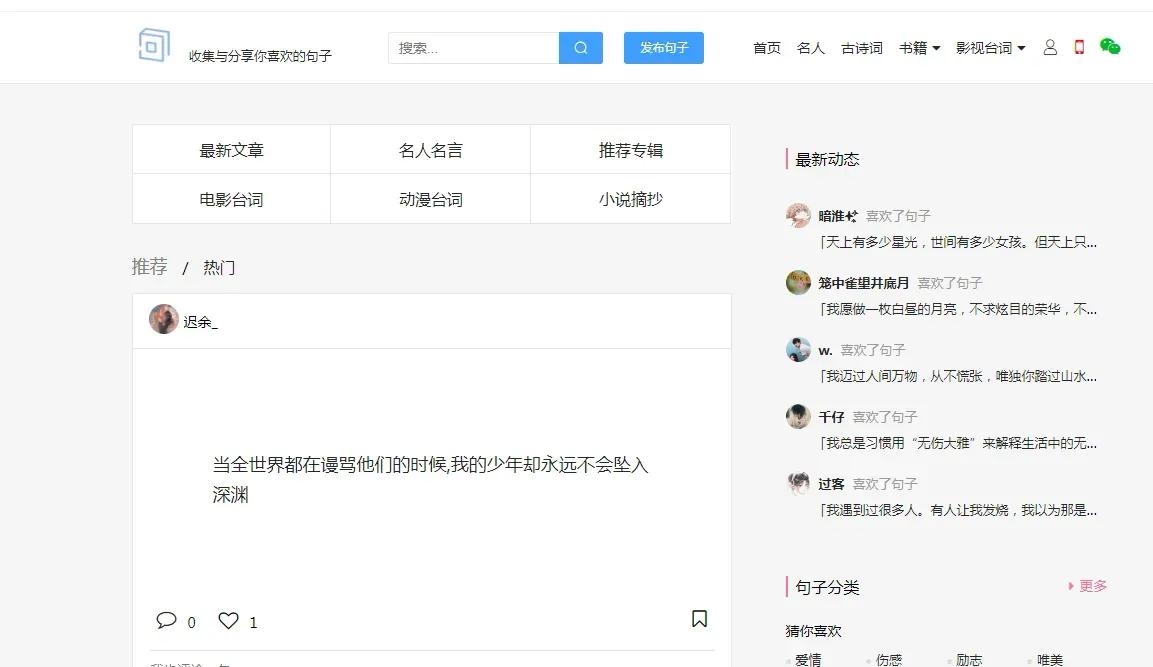 句子控全部是优美的文字句子,汇集众多散文美句、名人名言、经典名句、电影台词和歌词等等。有一说一,当你写文案无从下手时,这些网站能给你提供无限灵感,自动生成的各种文案能让你拓展思路,相当于每天都能更新自己的灵感库。