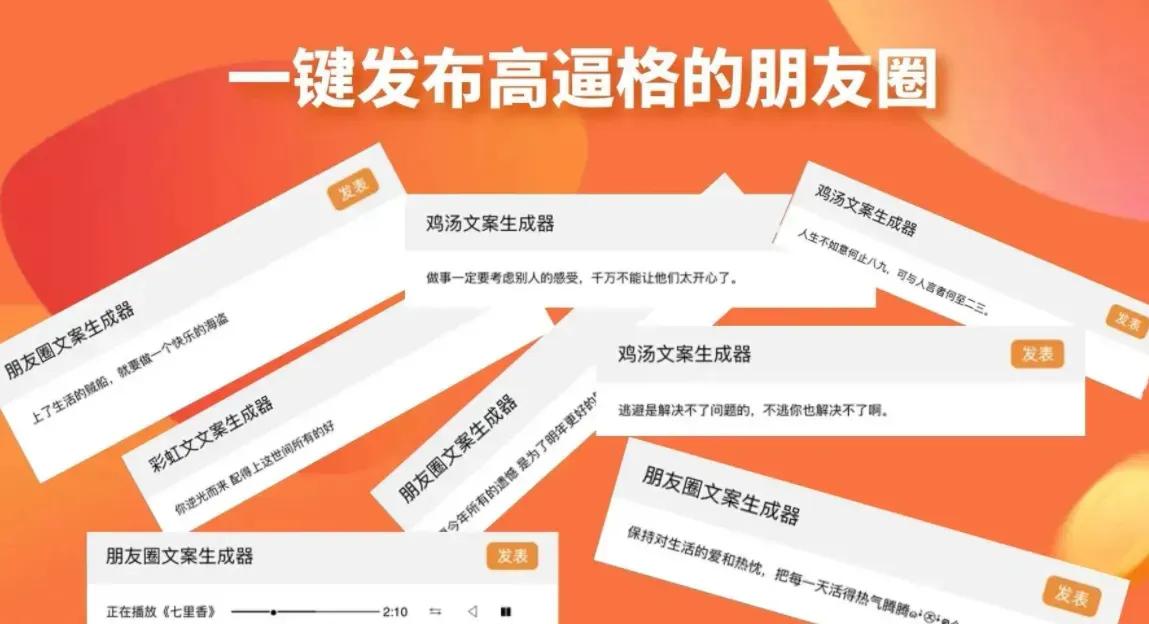 这名字顾名思义就是生成朋友圈文案的工具,这个工具界面和毒鸡汤生成器界面几乎是一样的,用了这个工具可以让你的朋友圈点赞数蹭蹭上涨好几倍,特别是在生日、节假日、纪念日等一些特殊的日子,图片拍好看了却不知道怎么配文的,这个工具将是你的得力干将噢!