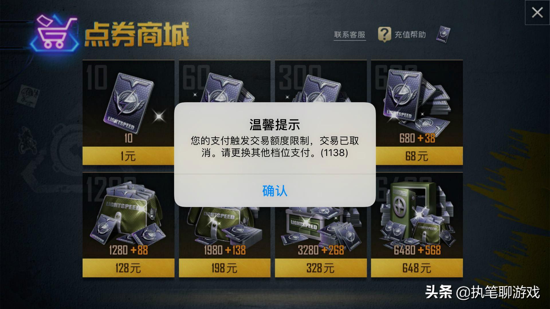 如上图所示,这位玩家为了做实验,就在游戏中连续充了100次的1元档点券,最终触发了26字提示和4个数字~1138这组数字并不懂什么意思,但是26字提示的意思是玩家触发的额度限制,所以被取消,并且让玩家更换其他档位来支付。所以通过这个实验也可以看出,游戏中对于充点券还是有一定限制的,起码次数方面有上限哦!