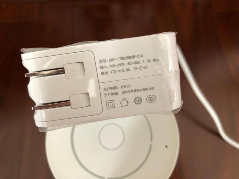 电源适配器是深圳索源科技生产的,输出功率是17V=3A,电源插上后,因为线材是面条的造型,索源可以直接埋进音箱,这样音箱就可以平放了