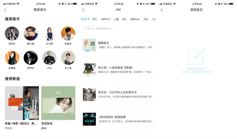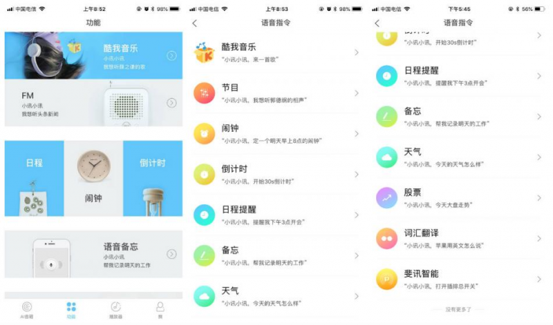 进入界面后,显示的还是比较直观,简单的,音乐库是跟酷我音乐合作的,然后还有FM功能,日常的简单办公提醒功能都有,可以设置日程和闹钟提醒,等等,还有一些语音备忘,都是一些办公的功能,点开语音指令里面,有很多,进去看看内容也挺丰富的,音乐啊,FM啊,还有一些日常使用的翻译等等,大家可以自行去发觉其他新的东西,这里就不赘述了!