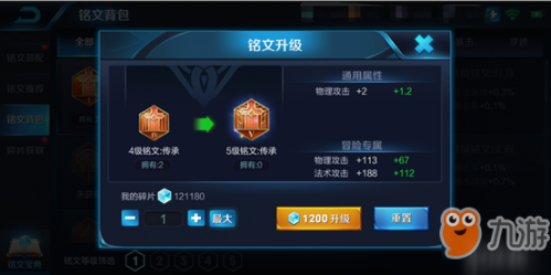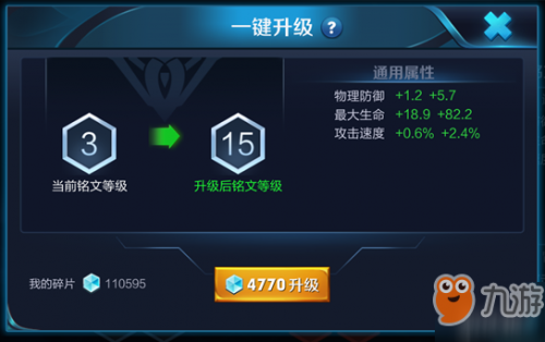当玩家拥有足够的铭文碎片时,可以直接将低级铭文升级为属性相同、数值更高的高级铭文,也可以一键将某个铭文页上的所有铭文进行升级。