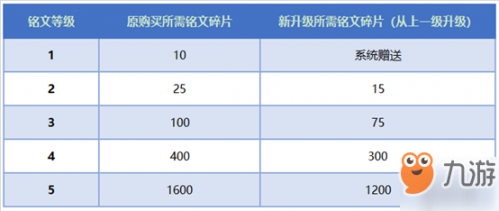 新版铭文系统中每升一级铭文所需铭文碎片数量如下表所示: