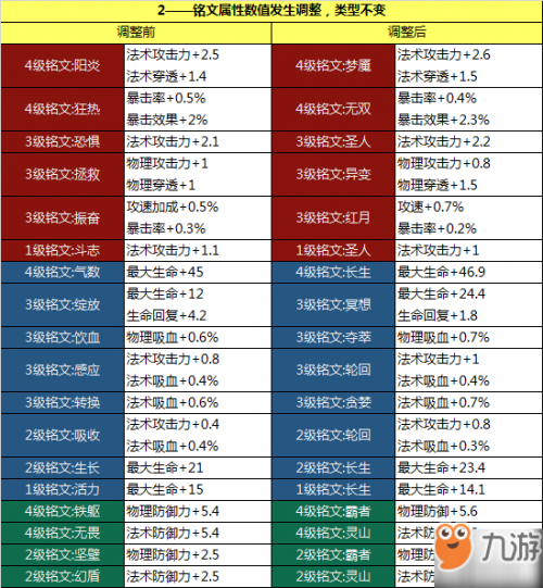 调整前后1-4级铭文命名及属性对应关系如下表所示: