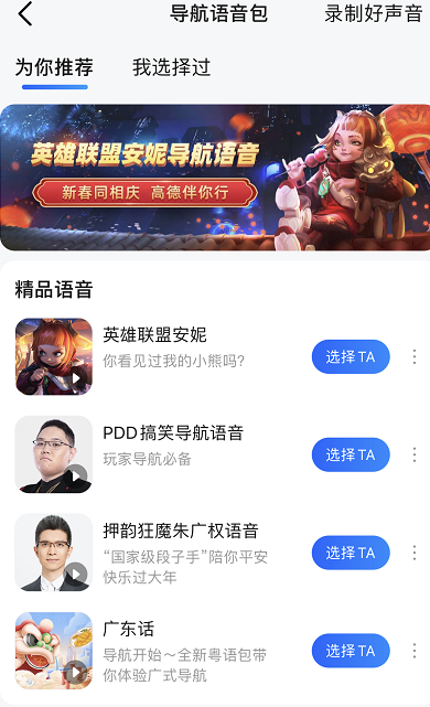 打开高德地图语音包选项,进入导航语音包界面,这里可以选择英雄联盟案例、朱广权、广东话等特色语音包。而在右上角,还有一个个小小的“录制好声音”按钮。
