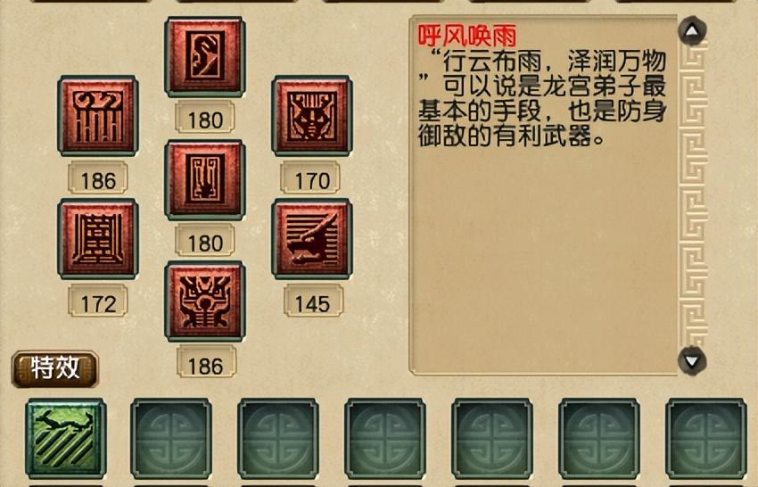 无附加效果,就1个技能龙卷雨击,最常用的技能,没有之一,挂机必备,提升呼风唤雨等级,即可提升龙卷雨击伤害。