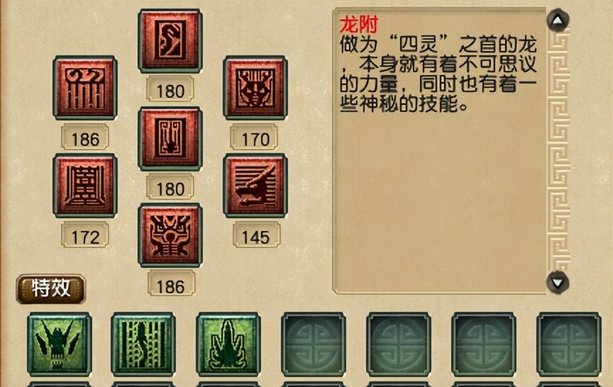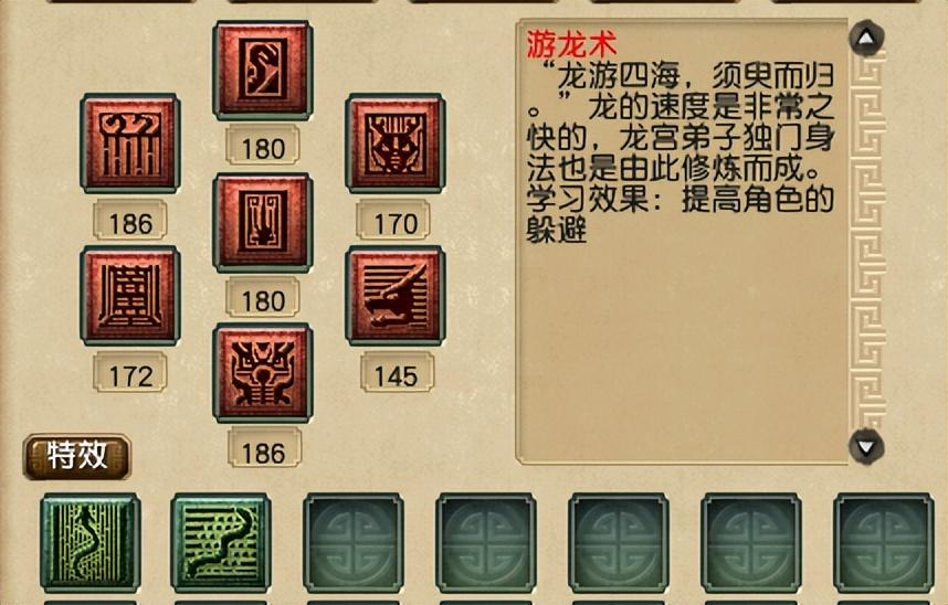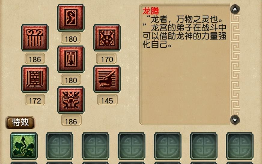 附加效果:提升角色伤害。含有1个技能,神龙摆尾,减少20%受到的物理伤害,龙宫应对物理攻击的保命技能。