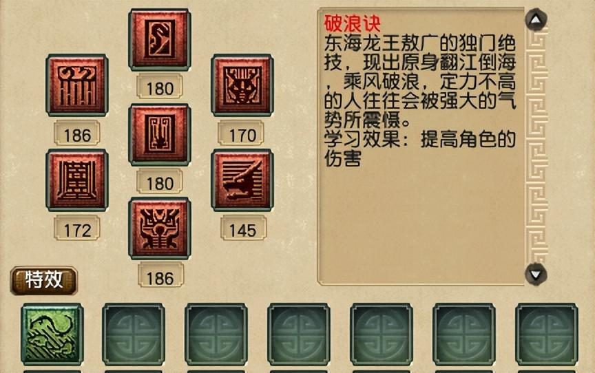 3、破浪诀,提升伤害,4点伤害等于1点法伤,伤害越高,法伤越高;(命中不算)