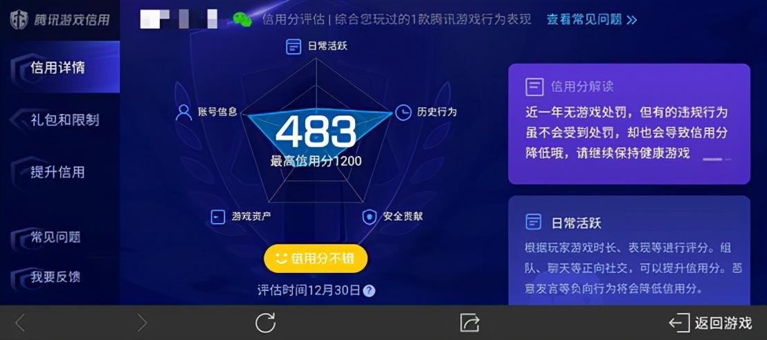 接下来就说说什么是腾讯游戏信用?腾讯游戏信用是腾讯游戏安全中心针对玩家在腾讯游戏中的账号信息、日常活跃度、游戏资产、安全贡献、作弊处罚等多维度信息,通过大数据计算综合得出的对玩家游戏信用水平的评分,评分越高表示玩家的游戏信用越好。腾讯游戏信用是基于玩家长期在腾讯游戏中的整体行为评估得出,长期保持健康正向的游戏行为可以提升您的游戏信用分。