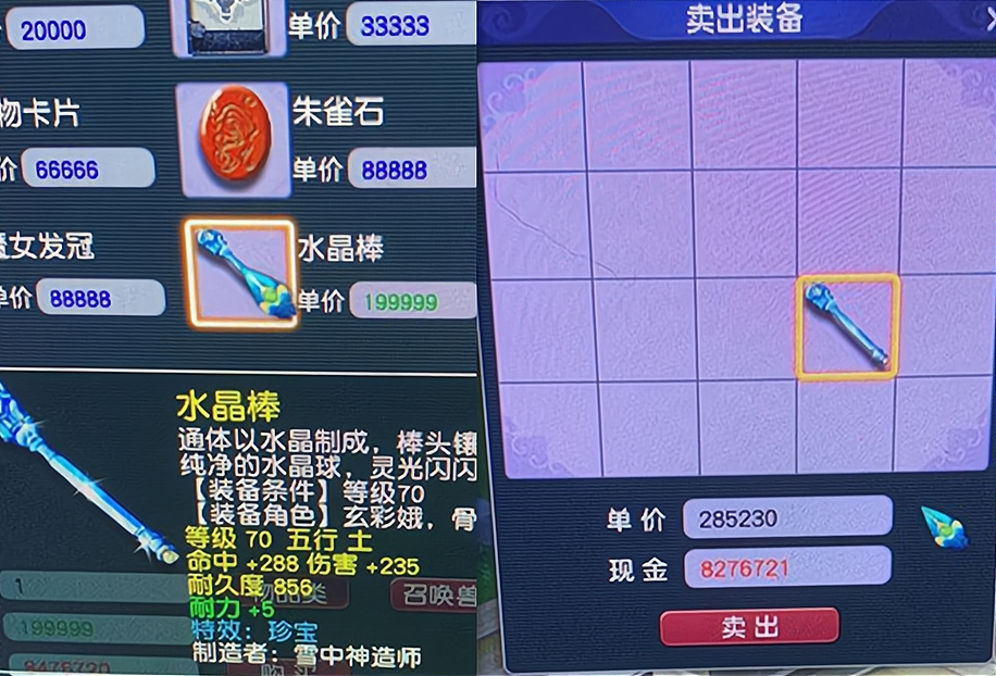 上面的这位玩家在摊位上也有20万梦幻币的价格购买了一个拥有着珍宝特效的70级人造的武器,这位玩家之所以会购买这把武器,是因为这件人造武器的耐久度属性比较高,拥有着珍宝特效又可以使系统收购的价格翻倍,这件武器最终是以28.5万的价格卖给了系统收购商。