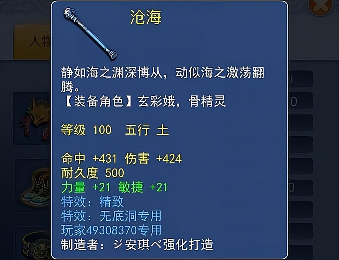 这是一把100级物理系梦想的武器,这把100级物理系梦想的武器还拥有着精致特效,也就是上面的这把武器是可以镶嵌11级宝石了,这把武器现在所拥有的属性是增加了21点力量和21点敏捷,虽然专用的门派是无底洞,但是只要这个角色的性别是女性,上面的这把武器是可以转到仙族的,仙族的女物理系门派还是比较强势的。