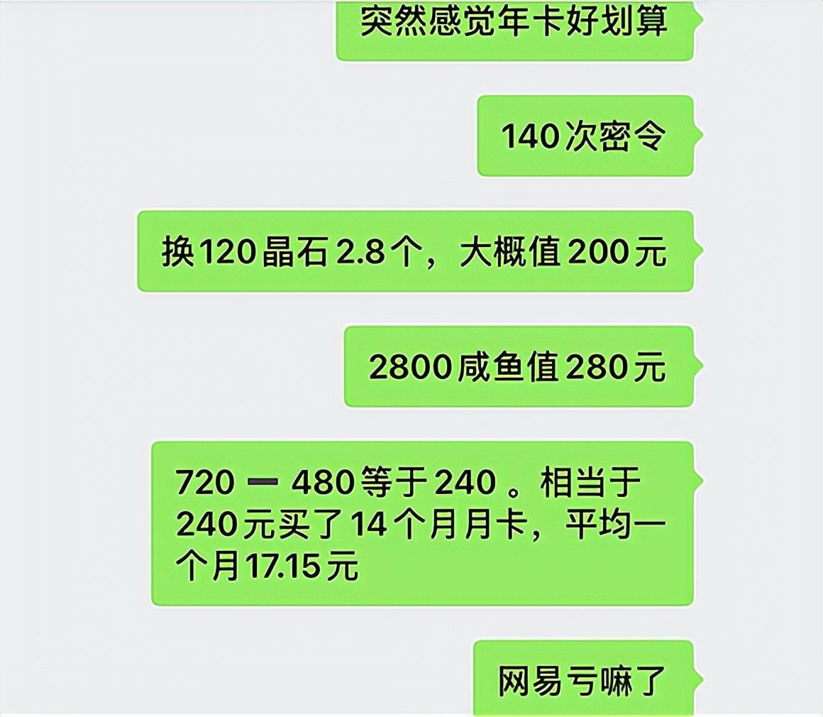 大家在梦幻中是可以将点卡转化为月卡跟年卡的,而且转化成月卡后还能够获得一些其他的福利,上面的这位玩家就计算了一下年卡的福利,将三界密令换成神器积分,再算上给的免费仙玉后,这位玩家算出来的结果是开了年卡,每个月的月均成本才17,这位玩家认为官方出售年卡其实是在亏钱的。