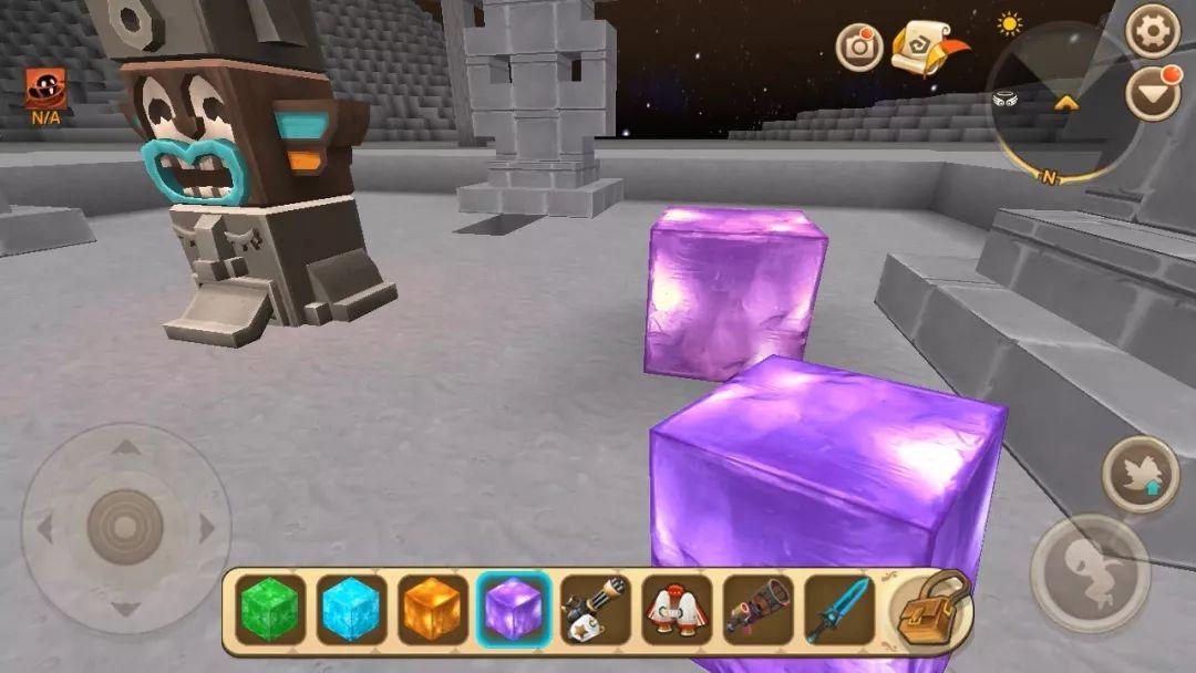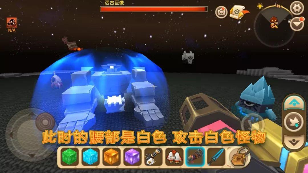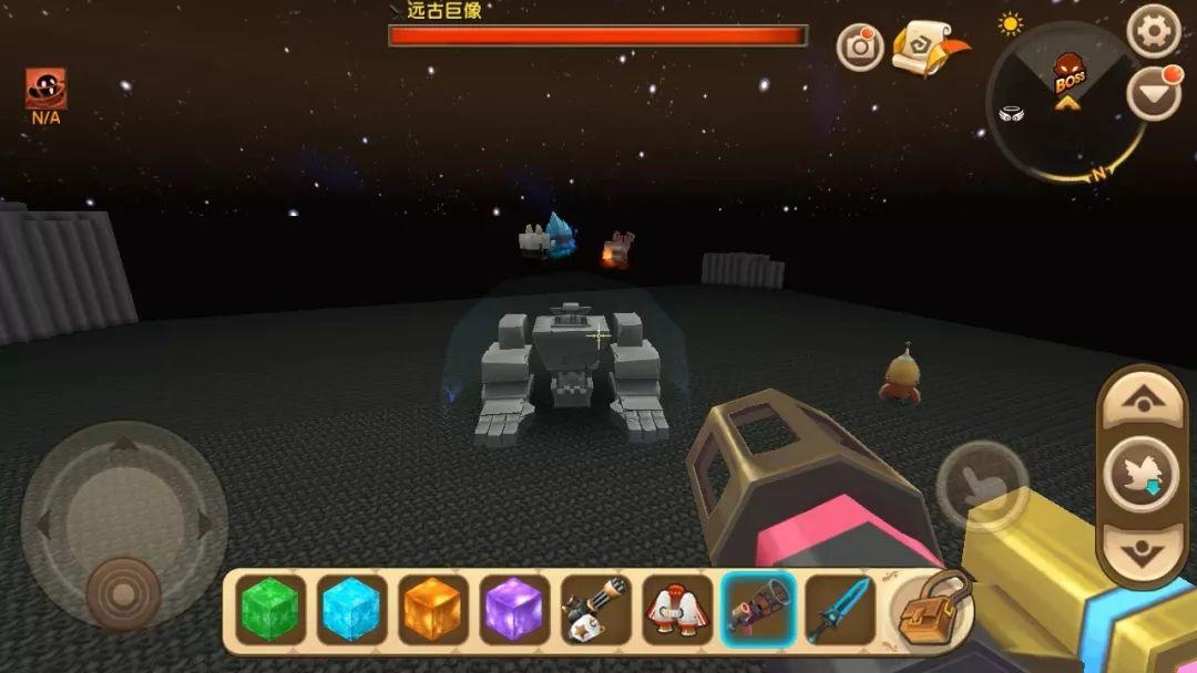 首先讲讲如何召唤远古巨像。来到萌眼星后找到图腾,以图腾为中心,在它的前后左右空3格的位置,也就是第4格的位置,分别摆上星铜石块、紫荧光石块、蓝钻块和孔雀石块。这些石块位置可互换。接着图腾会发射光束直通天际,地面会被染黑。接着远古巨像带着护盾buff闪亮登场,还伴着三个萌眼星起源怪物。这三个怪物的攻击方式和叮叮当当咚咚差不多,但会根据BOSS头部和腰部发出的光变厉害,这个A哥就不开玩法模式具体演示了,因为实在遭不住它们这一大家子的攻击,秒跪啊!