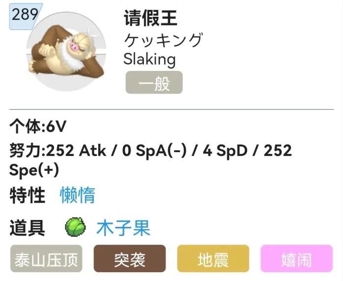 功能分析:请假王670的种族值堪比一级神,唯一的缺点就是特性过于拉胯,因此安排恰雷姆通过特效互换将瑜伽之力换给请假王,请假王攻击翻倍,直接乱杀。获得大力士特性后可以直接开启太晶地面清场,将对手和恰雷姆一起击杀,直接让后排的黑暗鸭上场提速,地震清场。个别没法通过地震直接击杀的宝可梦通过其他补盲技能收尾,道具携带木子果防止意外,如果追求高身板也可以将木子果替换为突击背心。