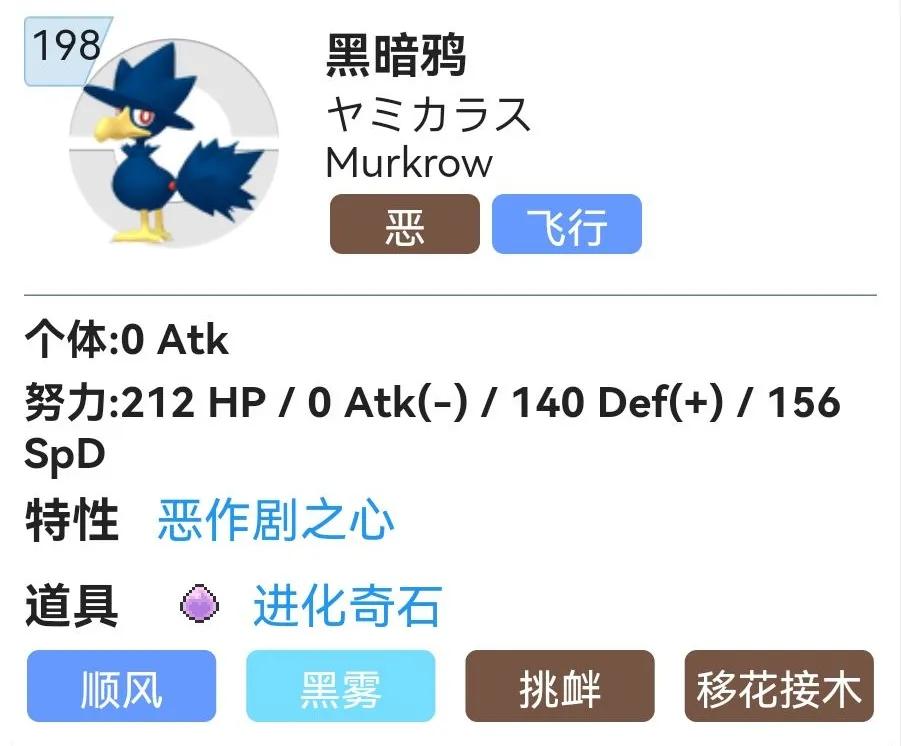 功能分析:请假王虽然身板优秀,伤害爆炸,100速度种族值也能称得上优秀,但还没有说是达到统治环境的地步,因此黑暗鸦可以在恰雷姆退场后顺风给请假王提速,同时可以挑衅防止对手的辅助手对我们的请假王进行限制,由于瑜伽神力对于请假王的加成并不会受到黑雾的影响,所以对于对手的强化还是可以放心大胆地进行复原的。