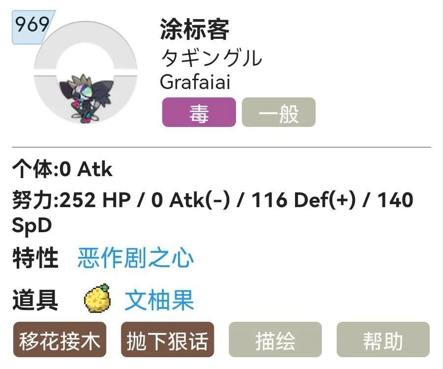 功能分析:特性互换请假王的套路最害怕的莫过于特性互换被对手的看我嘛或愤怒粉吸走,这时就需要我们的涂标客出场,使用描绘将自己和请假王的特性洗掉,虽然不如瑜伽之力请假王强势,但是哪怕是获得一个普通特性正面对攻的局面,能和请假王抗衡的宝可梦也不是很多。