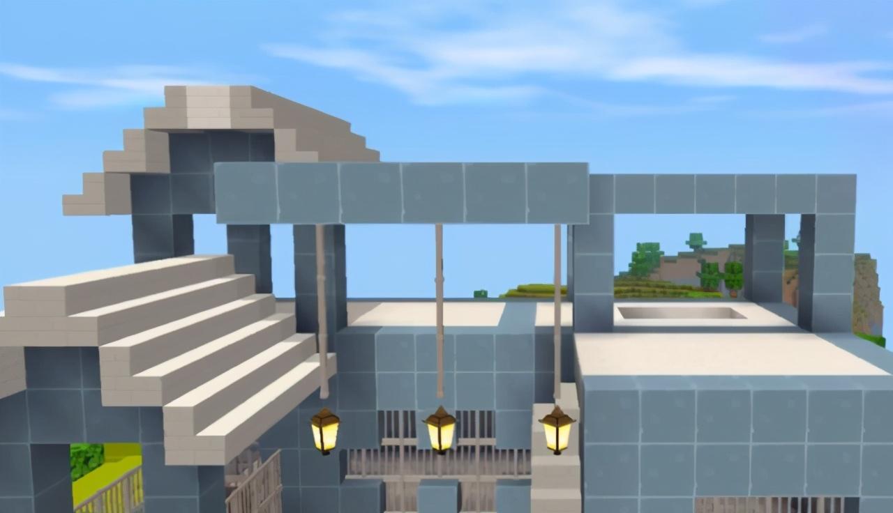 右侧及后面的边缘可以用台阶方块装饰一下,用烟囱和台阶方块设计一段围绕边缘的栏杆。在三层的平台下面用栏杆吊几个灯笼,这样一栋风格独特的现代化别墅就完成了。这栋别墅的特点在于,左右两边不对称,看起来别具一格。玩家可以对墙壁的颜色染色,让房子颜色更符合玩家的需要。玩家还可以在边上修建一个庭院,这样更像一栋独立的别墅。