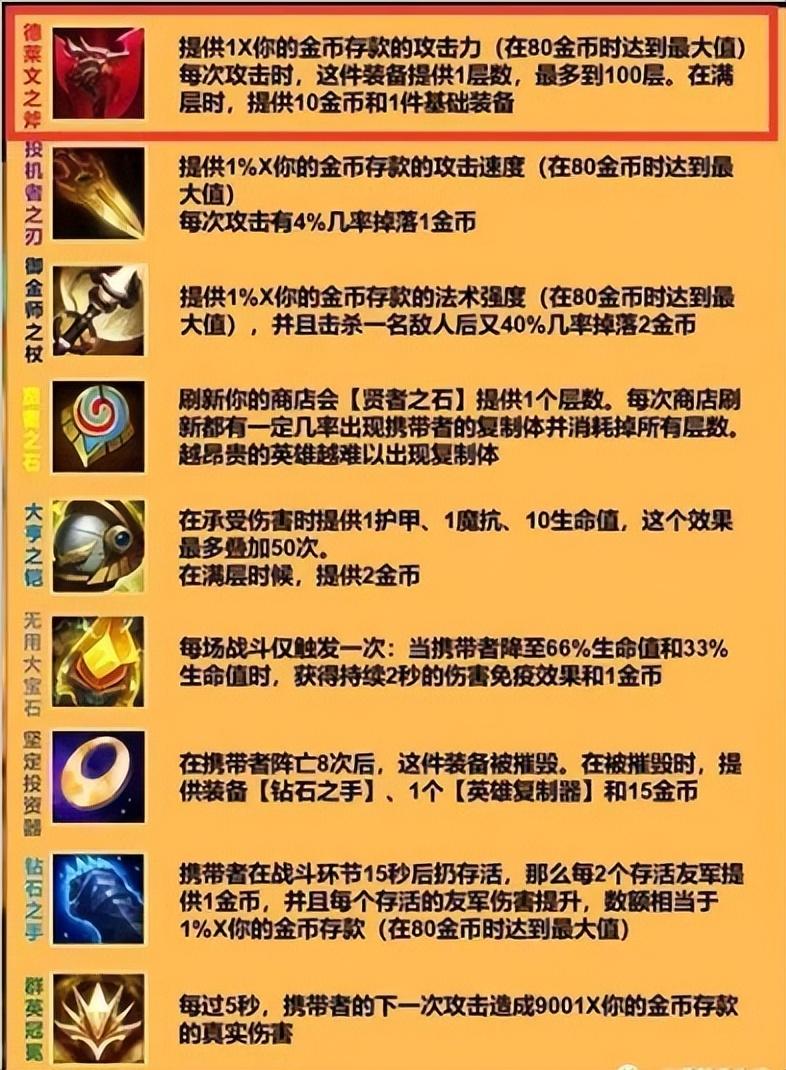 下面我们看看金鳞龙的装备。1,德莱文之斧,每攻击100次就会获得十金币和一件基础装备,攻击次数在不同回合可以继承,2,投机者之刃,打钱神器,金币越多攻速越快。,3御金师之杖金币越多法强越高.4大亨之铠等于一个泰坦,建议搭配传送门和石像鬼给艾达丝。5,无用大宝石,战斗15秒激活飞升和统治地位还有重赏之下三个海克斯的合集效果.6,贤者之石。增加刷新这枚棋子的几率。追三神器!7,坚定投掷器,带了这个装备的棋子,阵亡八次以后会激活钻石之手,跟上个赛季的护甲镀层类似,生命值到33%和66,免伤两秒。最后一件就是群英冠冕,简直逆天,每五秒触发一次,秒杀一切棋子,单体伤害。关于金鳞龙的装备,你要知道强度受益于金币数量,取消羁绊装备会消失,还有场上所有金鳞龙玩家的装备每一局都是一样的。
