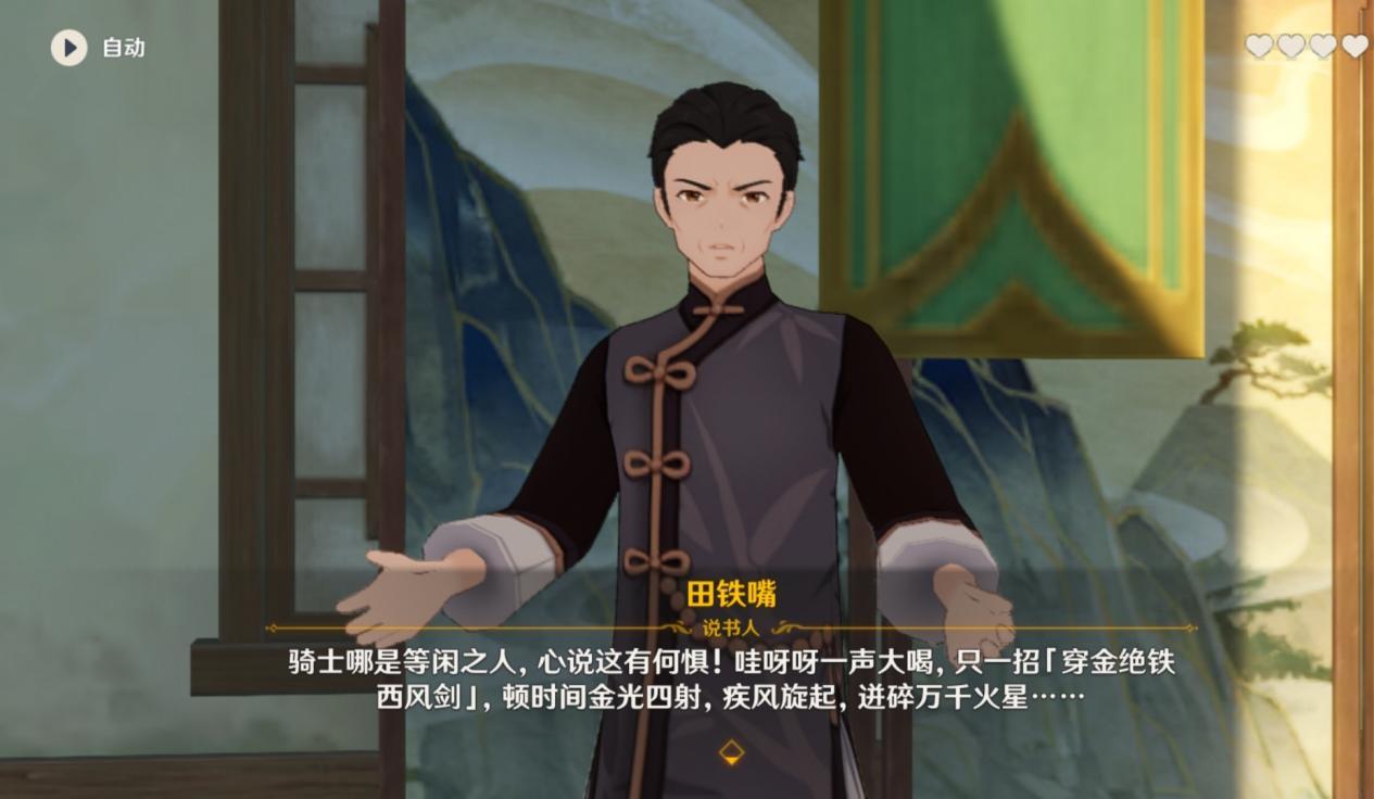 而说完了建筑、食物和人物外,当然少不了颇具中国特色的“玩”,在璃月,岩神钟离最爱什么呢?没错,就是听说,没有固定的形势和场合,可以只有一个说书先生,站在天桥或者桌凳前面,给百姓讲一些喜闻乐见的传奇故事,说书作为一门传统的民间艺术,现在很多地方也还流行着,还记得小时候最常听到的一句话就是“且听下回分解”,真是满满的回忆呀。