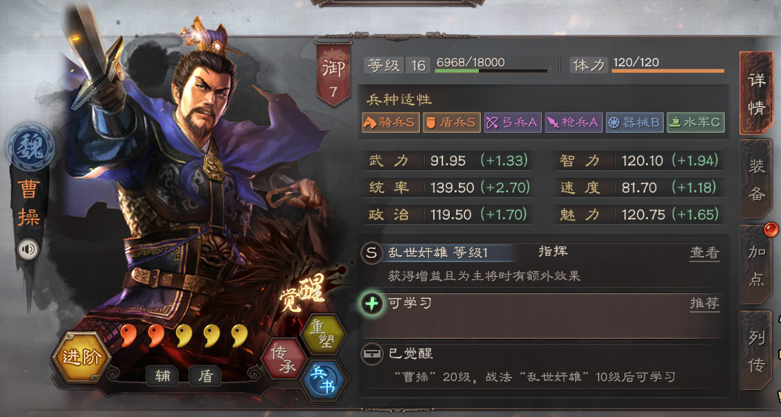 作为三皇之一,曹操的处境算是比较不错,属于魏国的辅助牌面,虽然曹操不是输出武将但是有他的辅助,都算是不错(如果有错也不是他的错),目前搭配思路除了司马盾就是目前比较火的渊骑,虽然奸雄骑与魏法骑已经走下坡路,但是这两套阵容曹操都属于核心武将!
